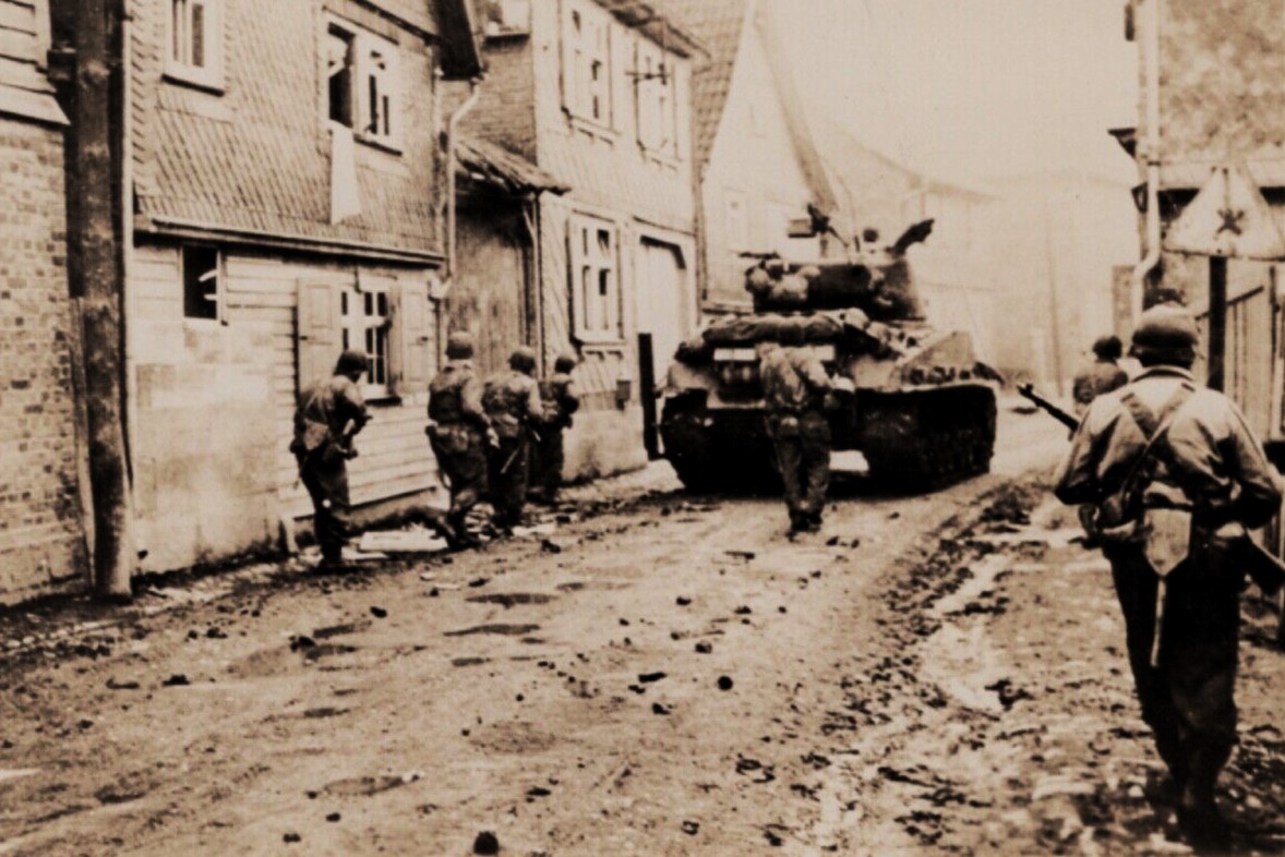 Im Schutz des gepanzerten Sherman: Amerikanische Infanterie bei der Einnahme süddeutscher Städte - April 1945 (Fotografie im Privatbesitz)